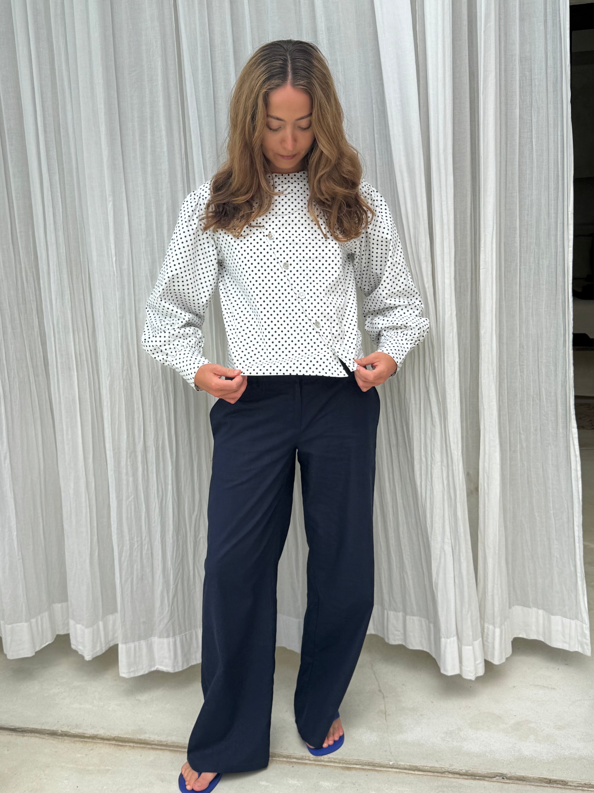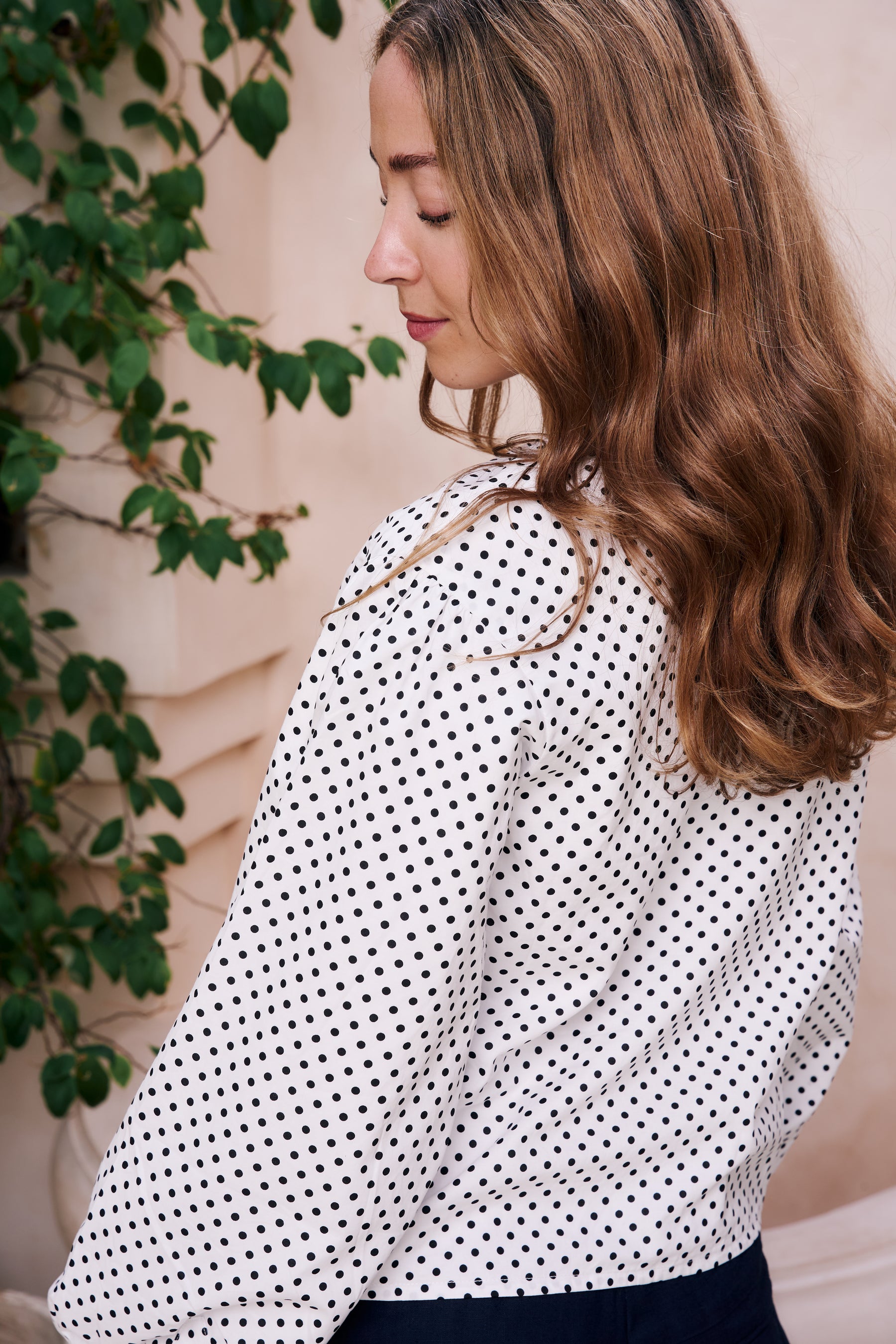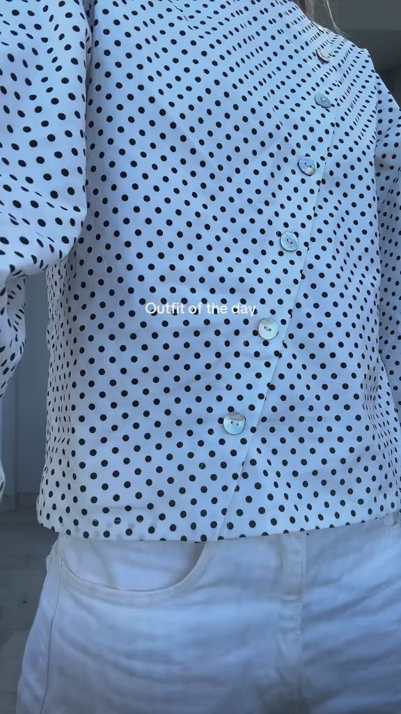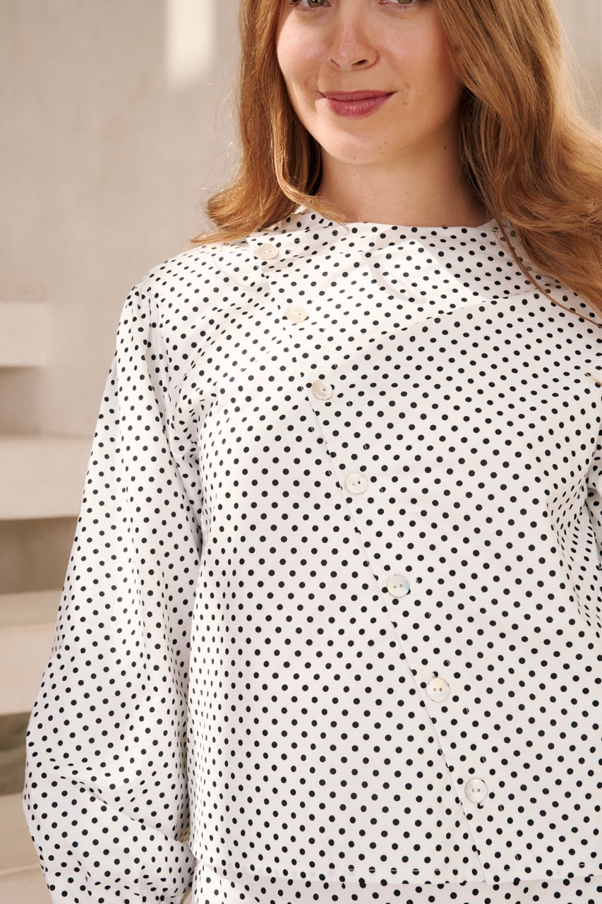 Polkaprikket skjorte med perlemorsfarvede knapper og store ærmer